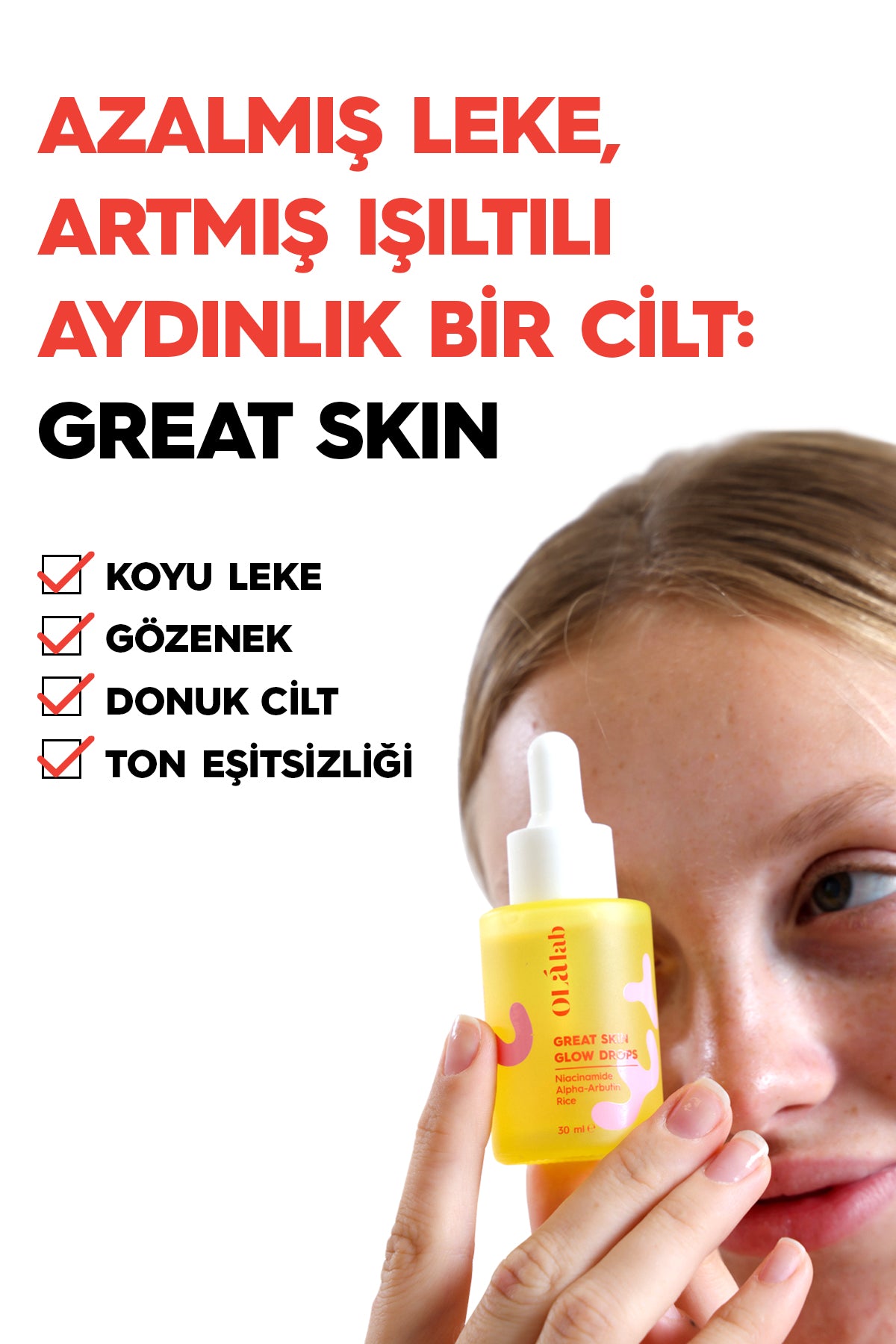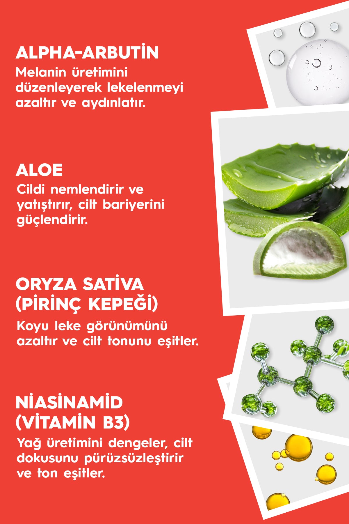 Cilt renk tonunu eşitleyerek daha pürüzsüz ve aydınlık bir görünüm sağlar. Leke karşıtı özellik gösteren Alpha-Arbutin, pirinç kepeği ekstraktı ve niasinamid gibi güçlü etken maddeleri içinde barındırır. Cilt renk tonunu eşitlerken aynı zamanda cildin nemlendirir ve yatıştırır.